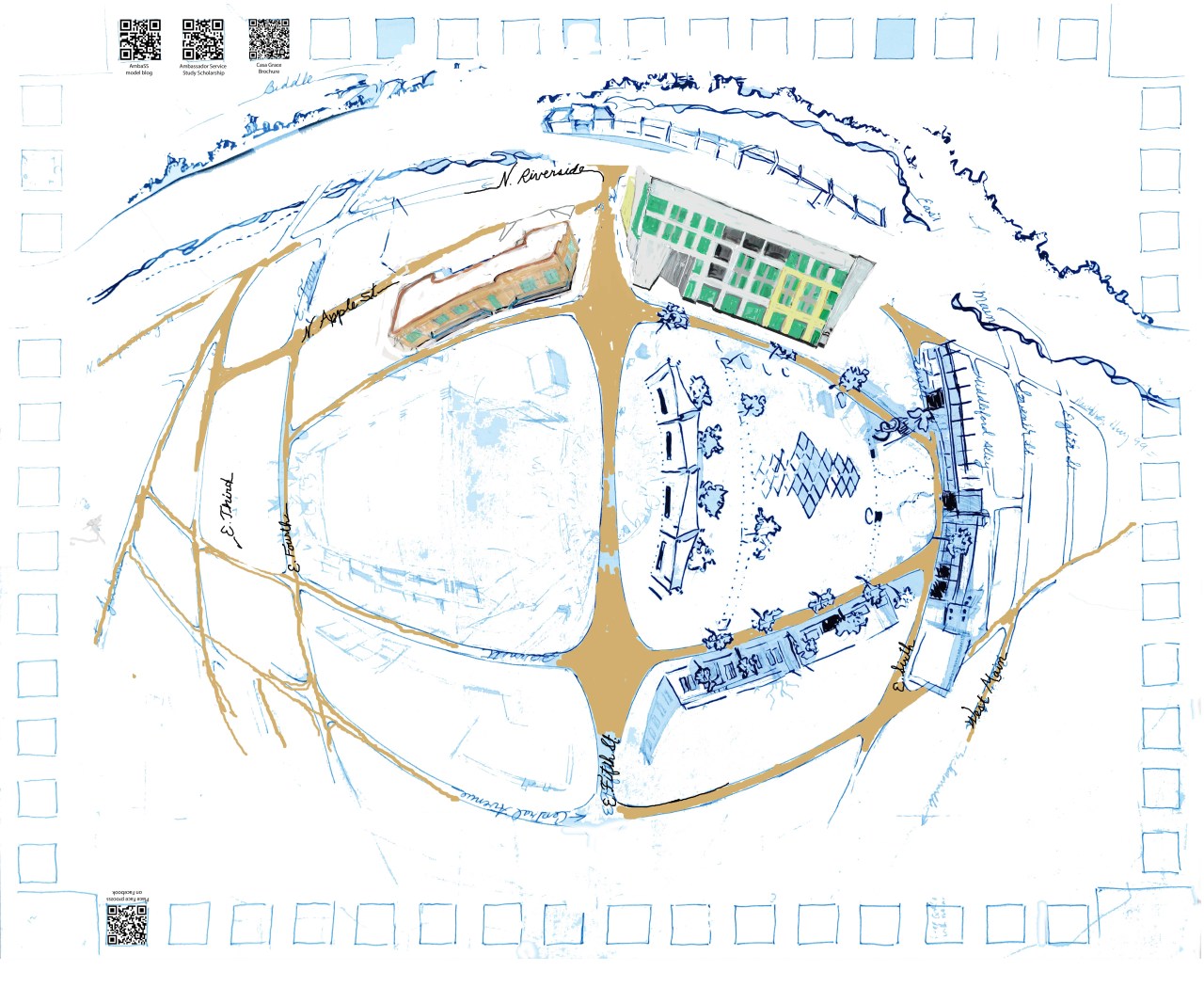 This is the “backside” of a Place Face tapestry, still in progress: the draft, complete with pencil, erasures, actual paper cut&paste, changes to come, and overlapping PhotoShop layers, but you can see where it is going. It’s a huge project: one poster, uniting a community in its stories. To add your own QR code, there are instructions and more info here: