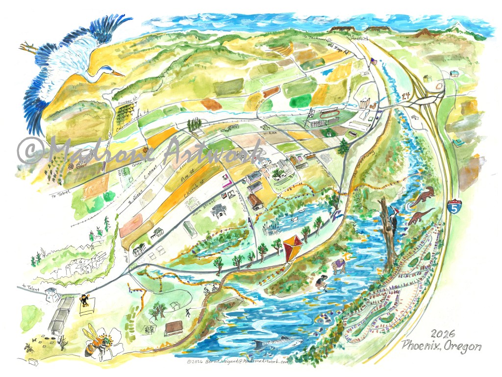The Phoenix City Visitors’ map, Sharing Nature and Neighbors, is done evolving, at least for 2026. The final version is just below. You can order paper or canvas prints through the Venmo link on the order form, or just email or call in your order. I also invite you to peruse other “Place Faces” in the two-page brochure called “Imagine” at this link, for inspiration on how you might use a Place Face of your own. https://bit.ly/Place-Face